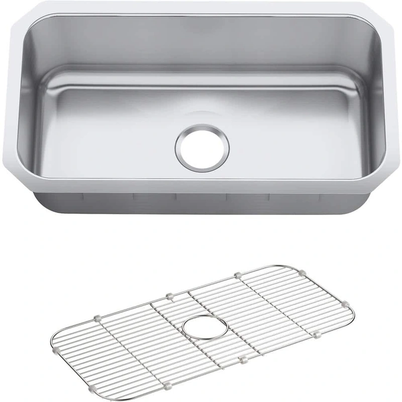 The KOHLER Undertone Preserve Undermount Sink combines durability with elegance, featuring a scratch-resistant stainless steel construction and mirror-finish edge. Its innovative sound-absorption system ensures a quieter kitchen environment, while the wide rectangular basin accommodates even your largest cookware with ease.