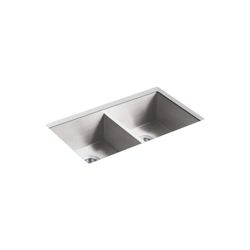 KOHLER Vault Undermount Double Bowl Stainless Steel Sink The KOHLER Vault 32" Undermount Double Bowl Stainless Steel Kitchen Sink offers a sleek, modern look with its stainless steel construction and contemporary design. Enhanced by a sound-absorption syst
