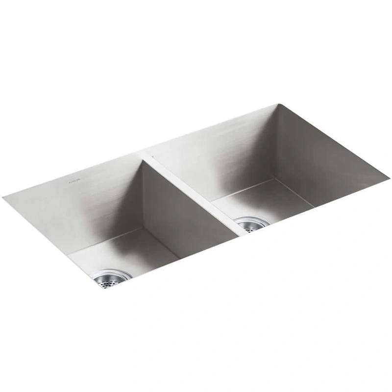 Kohler Stainless Steel Double Bowl Sink & Simplice Faucet The Kohler Vault 33-inch Double Bowl Kitchen Sink with Simplice Faucet is the perfect blend of style and functionality. Featuring an elegant high-arch faucet with a 360-degree rotating spout, th