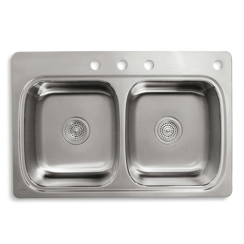 KOHLER Verse 33" Double Bowl Stainless Steel Sink The KOHLER Verse 33" Double Bowl Kitchen Sink combines sleek design with practical functionality. Made from durable 20-gauge stainless steel, it features SilentShield technology for noise reduction and a lo