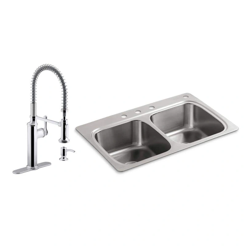 KOHLER Verse Double Bowl Stainless Steel Sink & Faucet The KOHLER Verse Drop-In Stainless Steel Double Bowl Kitchen Sink is designed for efficiency and style, featuring durable 18-gauge stainless steel with SilentShield technology for quieter performan