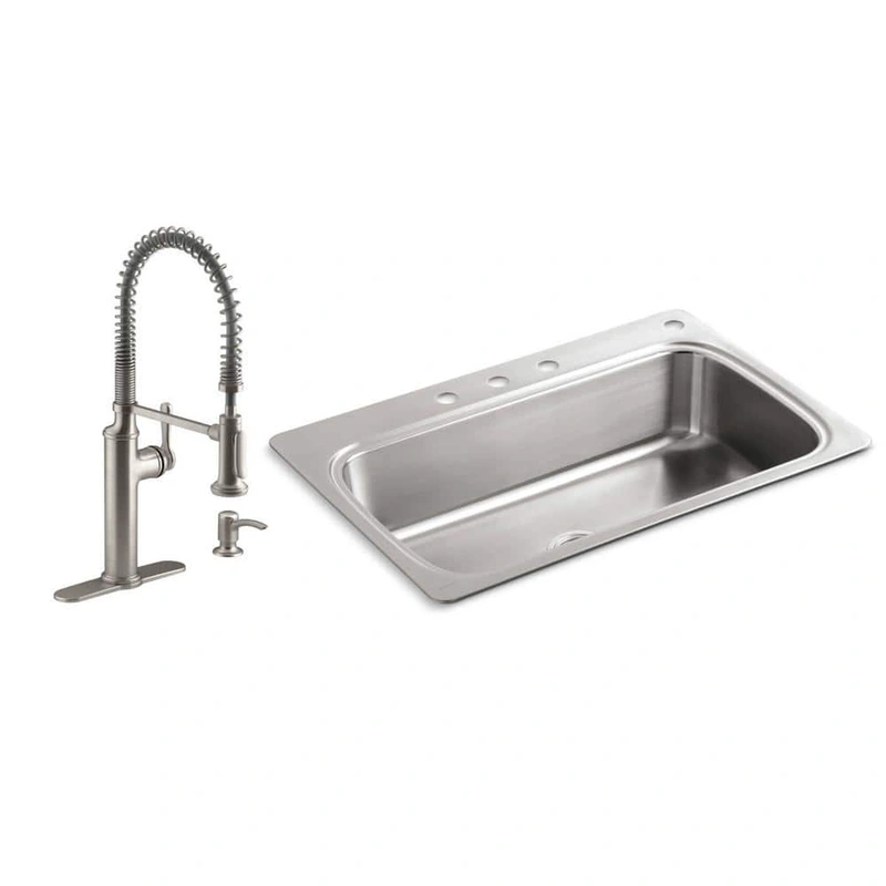 33" Stainless Steel Single Bowl Kitchen Sink & Faucet Combo The KOHLER Verse Drop-In Stainless Steel 33-inch Single Bowl Kitchen Sink, paired with a Sous Kitchen Faucet, brings professional utility and elegance to your kitchen. Its deep, wide bowl desi