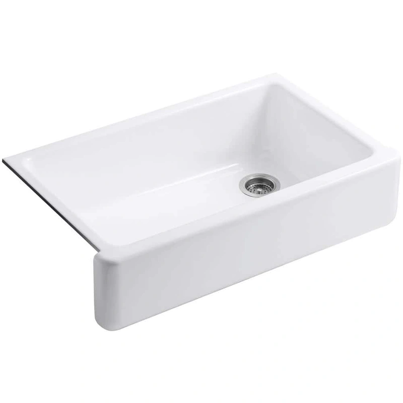 KOHLER Whitehaven 36" Farmhouse Sink Elevate your kitchen with the KOHLER Whitehaven 36" Farmhouse Sink, designed for beauty and functionality. This robust apron-front sink features self-trimming installation, crafted from durable enameled cast iron that r