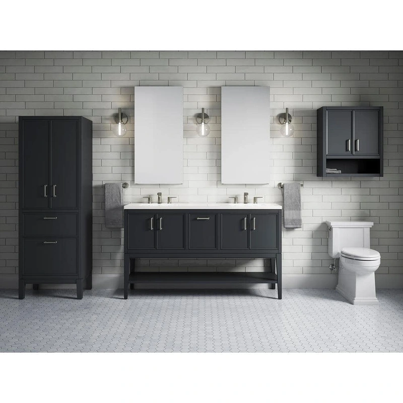Transform your bathroom with the KOHLER Winnow 60-inch Freestanding Bath Vanity in Slate Grey, featuring a sleek, durable white quartz top. This double sink vanity combines classic Shaker style with modern elements, offering ample storage and a sophisticated, timeless look.
