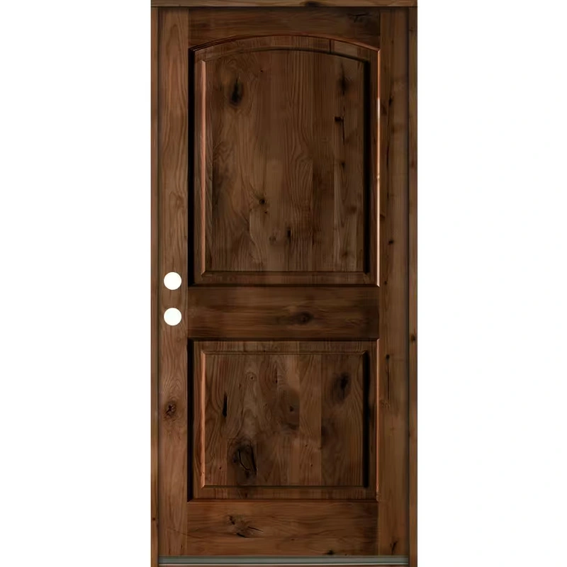 Upgrade your home with the Krosswood Doors Rustic Knotty Alder Arch Top Provincial Stain Right-Hand Inswing Wood Single Prehung Front Door and enjoy a blend of beauty, functionality, and durability.