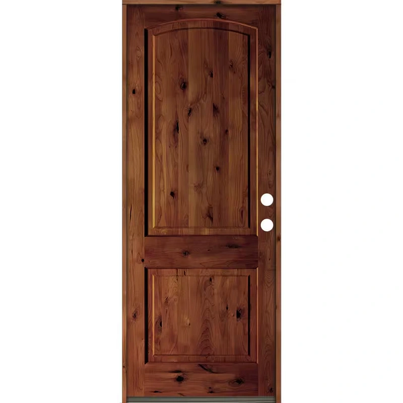 Introduce a blend of rustic elegance and robust functionality into your home with the Krosswood Doors Rustic Knotty Alder Arch Top Front Door. This exquisite door is masterfully crafted from high-quality knotty alder wood and finished with a rich red chestnut stain that enriches its natural allure. Featuring an arch top design and distinct visible knots, it provides a warm and inviting entrance, perfectly complementing both traditional and contemporary home decors. Designed for easy installation, this prehung door comes with a left-hand inswing configuration to seamlessly integrate into your entryway.