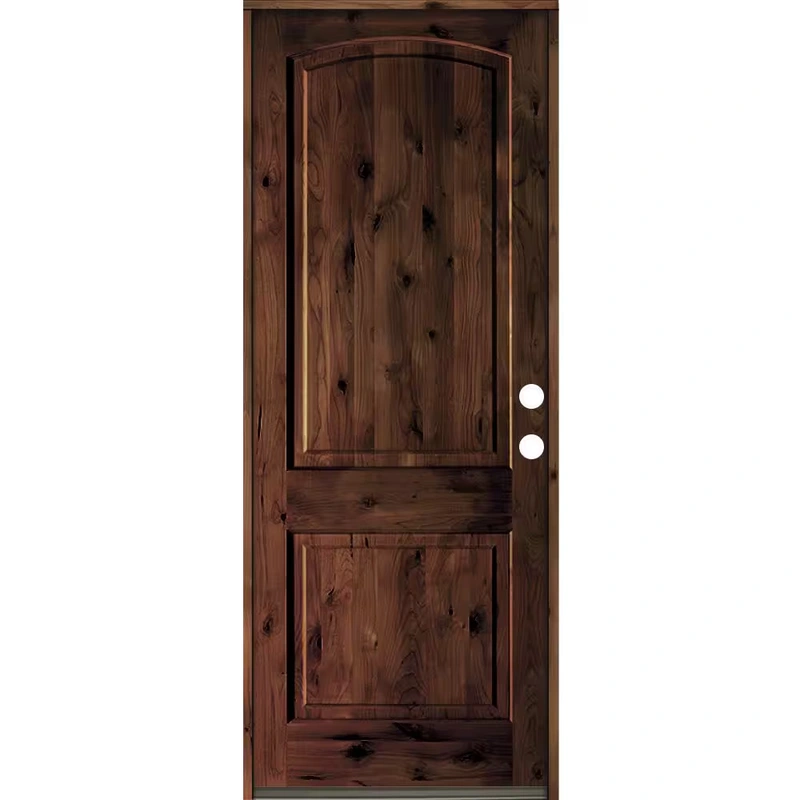Enhance your home’s entrance with the Krosswood Doors Rustic Knotty Alder Arch Top Red Mahogany Stain Left-Hand Inswing Wood Single Prehung Front Door, a perfect blend of rustic charm and modern durability.