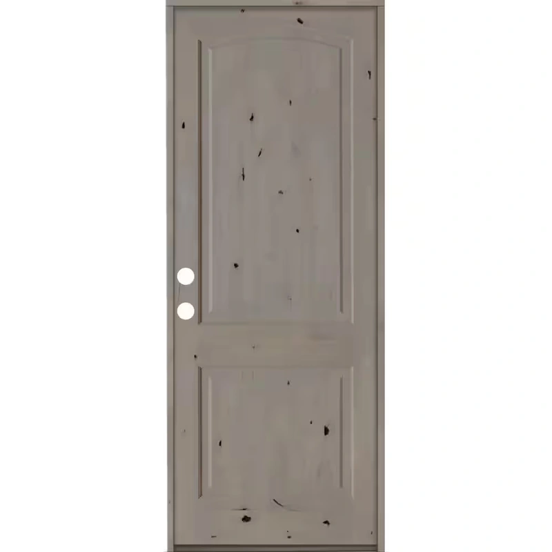 Elevate the entry of your home with the Krosswood Doors Knotty Alder 2-Panel Front Door. Crafted from high-quality Knotty Alder wood, this door features a right-hand/inswing configuration that merges style with functionality. The elegant grey stain adds a refined touch to any architectural style, making it an ideal choice for both traditional and modern homes. Its robust construction and detailed craftsmanship offer both beauty and long-lasting durability.