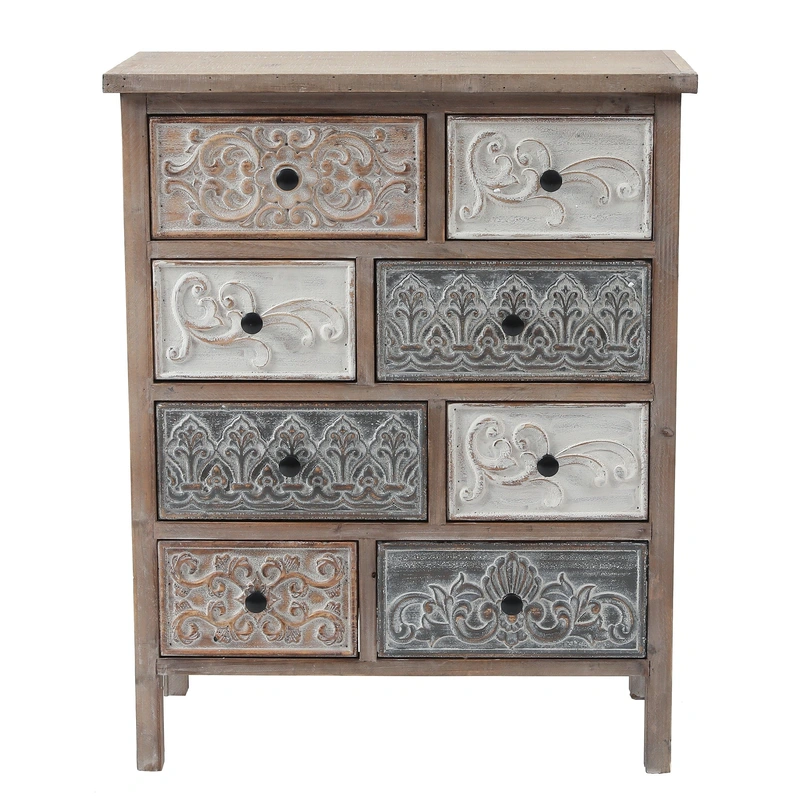 Immerse your room in the warm embrace of rustic elegance with this exquisite 8-drawer chest. The harmonious mix of natural wood tones and intricately carved drawer inlays creates a stand-alone artful charm, effortlessly elevating any aesthetic. Picture it by your reading chair, holding precious keepsakes and adding texture to your interior. True luxury lies in functional beauty, making this chest a pivotal piece in both style and utility.