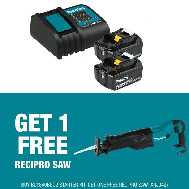 Makita 18V LXT Battery & Charger Pack with Cordless Recipro Saw The Makita 18V LXT Lithium-Ion Battery and Charger Starter Pack includes a high-performance battery and rapid charger, perfect for powering Makita's extensive line of cordless tools. With
