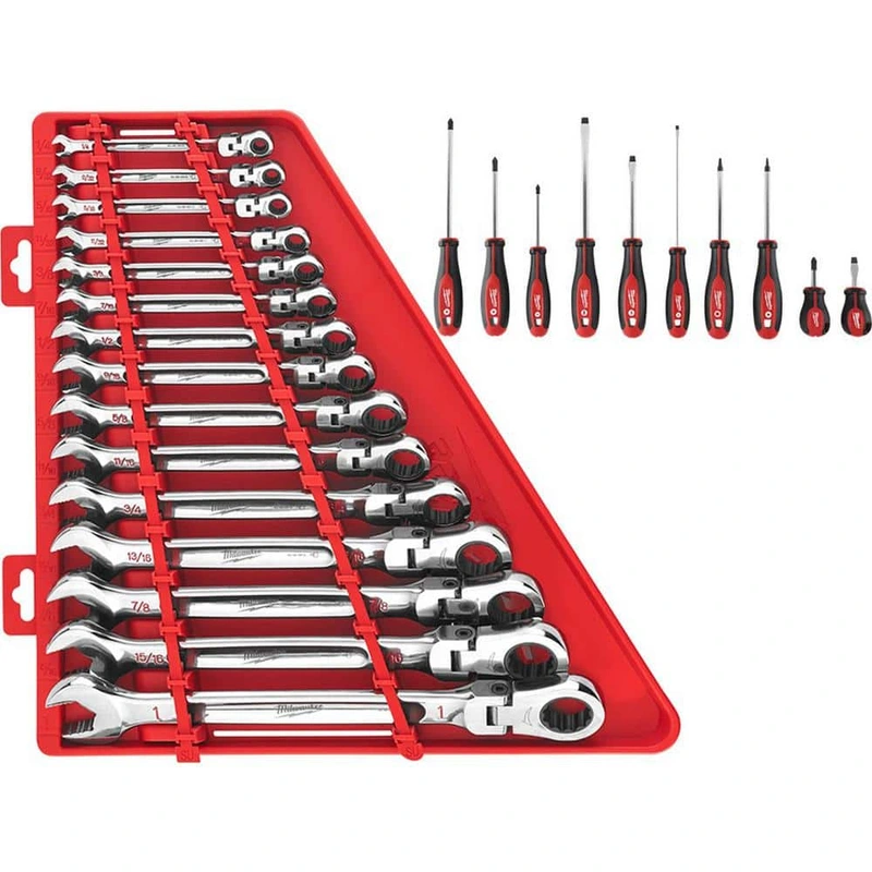 Milwaukee 25-Piece Flex-Head Ratcheting Wrench & Screwdriver Set The Milwaukee 144-Position Flex-Head Ratcheting Wrench and Screwdriver Set is a robust solution for any professional or DIY enthusiast, designed to tackle tough-to-reach spaces with ease.