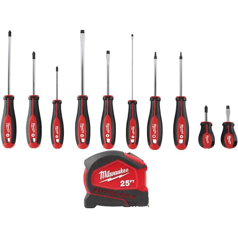 Milwaukee 11-Piece Screwdriver and Tape Measure Set Get ready for any task with the Milwaukee 11-Piece Screwdriver and Tape Measure Set. This professional-grade package combines a comprehensive screwdriver set with a robust 25 ft. auto-lock tape measure. E