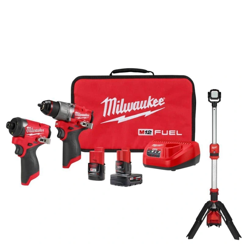Milwaukee M12 FUEL 12-Volt Lithium-Ion Brushless Cordless Hammer Drill, Impact Driver, Stand Light Combo Kit w/2 Batteries & Bag