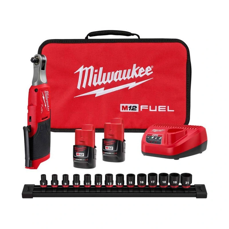 Milwaukee M12 Brushless High-Speed Cordless Ratchet Kit The Milwaukee M12 FUEL Brushless 3/8 in. Cordless Ratchet Kit offers the fastest speed and ultimate durability for professional users. With a compact head and advanced FUEL technology, it ensures supe