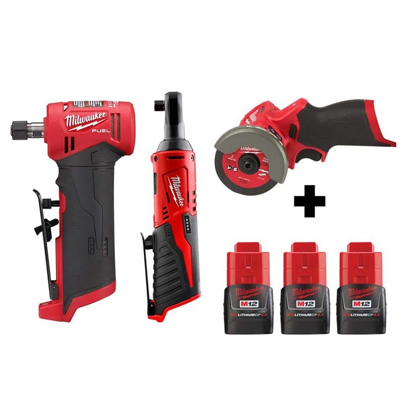 Milwaukee M12 FUEL Cordless Combo Kit The Milwaukee M12 FUEL Cordless Combo Kit offers a versatile and powerful solution for professional contractors, featuring a right angle die grinder, ratchet, and cut-off saw. Engineered with Milwaukee's POWERSTATE Bru