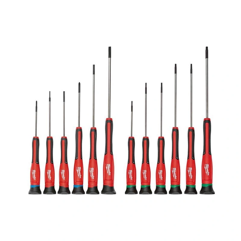 Milwaukee 12-Piece Precision Screwdriver Set Upgrade your tool collection with the Milwaukee Precision Screwdriver Set, featuring 12 pieces designed with all-metal cores for exceptional strength and durability. The set includes both Phillips and Torx screw