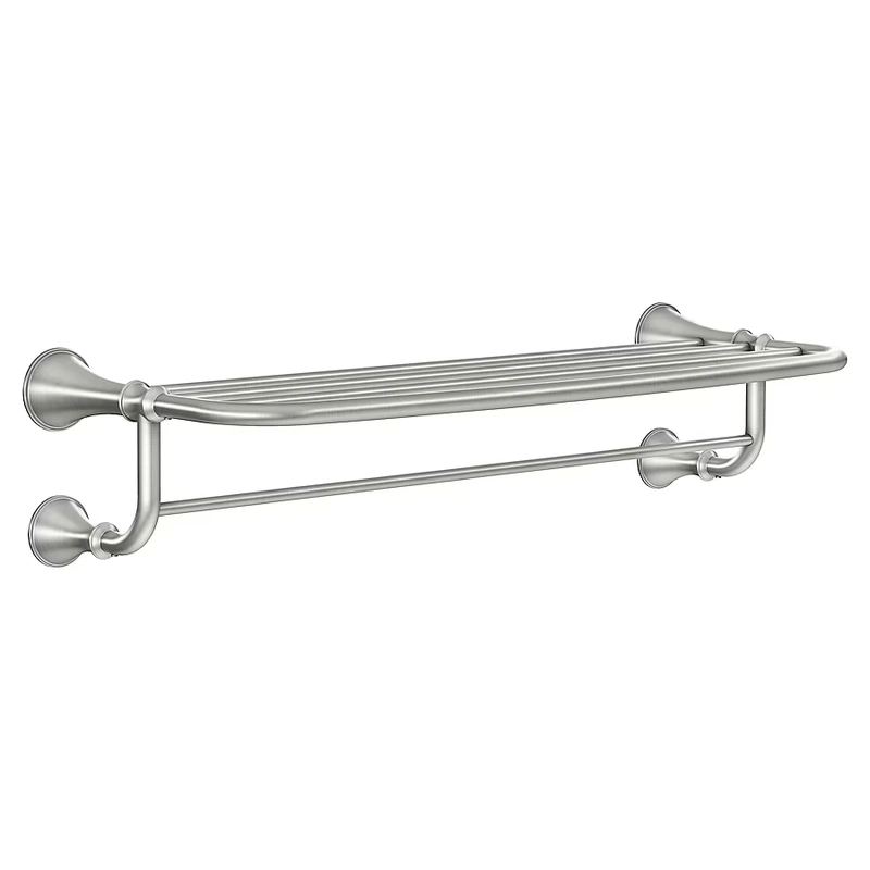 Modern design with smooth, clean linesIncreases storage space for towelsMulti-bar shelf provides overhead storageLower bar for hanging wet towelsLifetime limited warrantyQuick, easy installation with included template and mounting hardwareMeasures 26.36 by 9.81 by 6.20 inches (L x W x H) when fully assembledSpot Resist brushed nickel finish resists water spots and fingerprintsBacked by Moen’s Limited Lifetime Warranty
