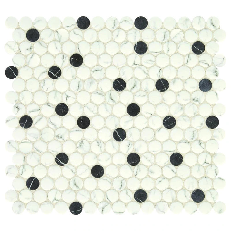 Elevate your home with the Mohawk Brightmore Winter Stark Glass and Stone Penny Round Mosaic Tile. This captivating mosaic tile combines polished and matte finishes, featuring elegant white and subtle gray hues that enrich any wall or floor space with sophistication. Perfect for indoor and outdoor applications, these tiles transform kitchens, bathrooms, and even fireplaces with ease.