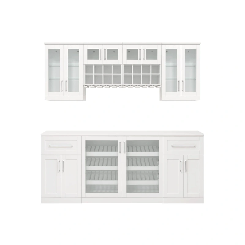 NewAge Home Bar 84-in White Bar Cabinet Elevate your entertaining space with the NewAge Products Home Bar, an 84-inch white rectangle bar cabinet designed for both beauty and function. Crafted with a solid plywood core and classic shaker style, it offers m