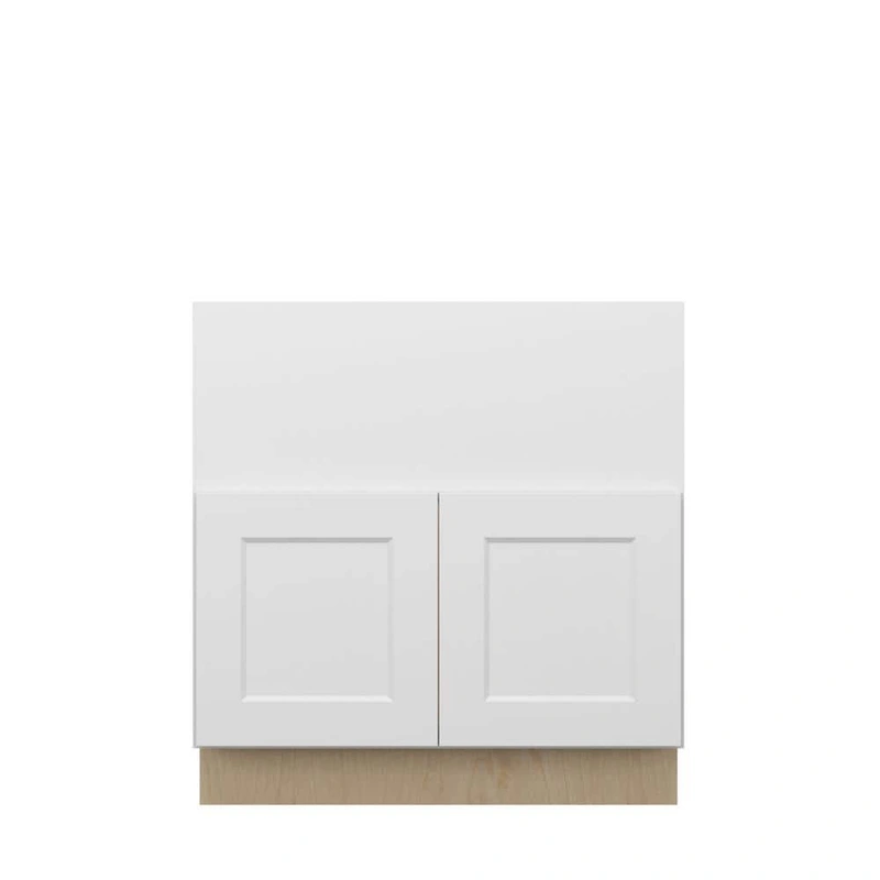 Norfolk Shaker White Farm Sink Base Cabinet 33" Elevate your kitchen with the Norfolk Shaker Farm Sink Base Cabinet by Kunal Kitchens. Designed with a timeless Shaker style in painted white, this elegant cabinet combines solid birch face frames and HDF doo