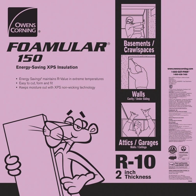 Product Overview Elevate your insulation standards with Owens Corning R-10 FOAMULAR Extruded Polystyrene Insulation. This premium 2-inch thick foam board provides exceptional thermal protection and an R-value of 10, ensuring superior energy efficiency and comfort in both residential and commercial settings. Designed for durability and long-term performance, it effectively reduces energy costs while enhancing overall comfort. Owens Corning FOAMULAR XPS insulation is a closed-cell, moisture-resistant rigid foam board well-suited for a variety of applications, including above and below-grade projects.