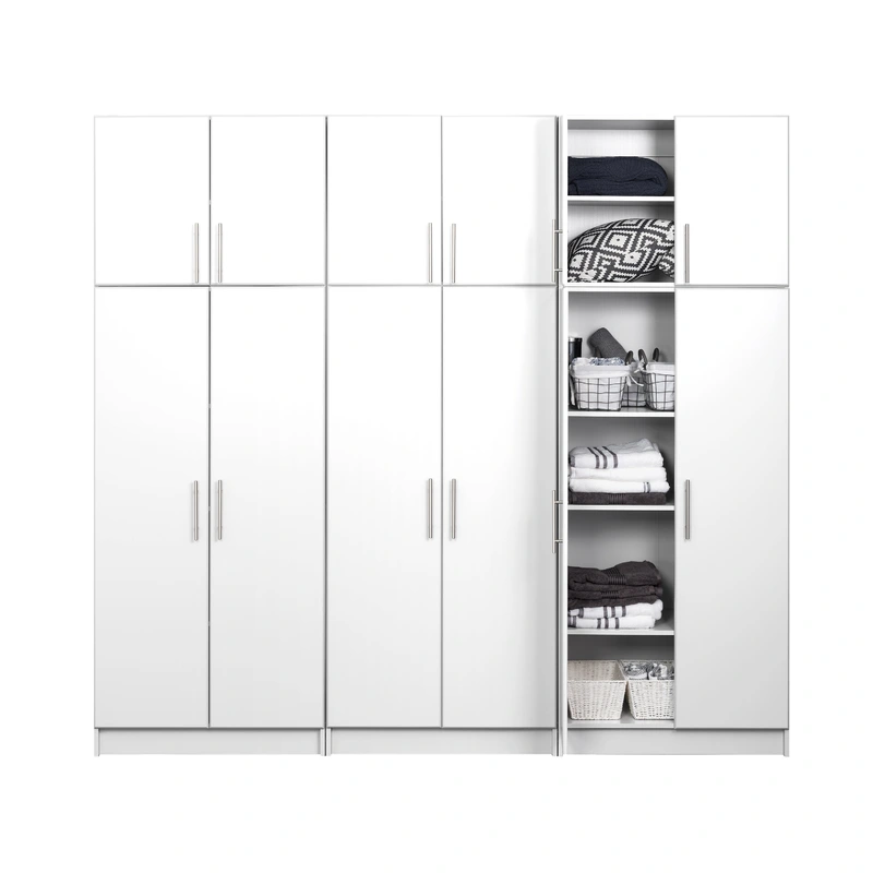 Elite 96" Freestanding Utility Storage Cabinet Upgrade your storage with the Prepac Elite Freestanding Utility Storage Cabinet. Designed for flexibility and style, this cabinet features a clean white laminate finish, robust build using non-toxic composite