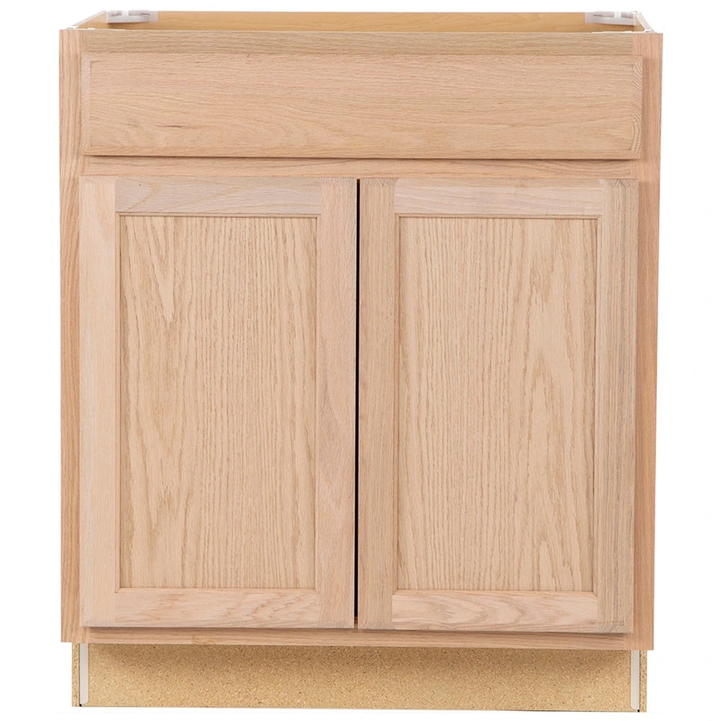 Oak Brook Natural Unfinished Oak Base Cabinet The Oak Brook 30-Inch Base Cabinet is crafted from durable unfinished oak, allowing customization through painting, staining, or a natural look to complement any decor. Featuring a practical flat panel design,