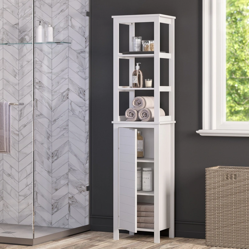 RiverRidge Madison Linen Cabinet Transform your bathroom or laundry space with the RiverRidge Madison Linen Cabinet, designed for class and efficiency. This tall, narrow cabinet features open shelving for display and a bottom cabinet door to neatly conceal