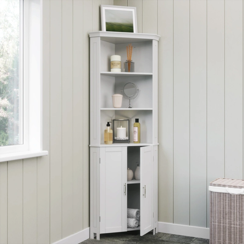 Somerset White Corner Linen Cabinet Maximize your storage in tight spaces with the RiverRidge Somerset White Corner Linen Cabinet. Designed to fit snugly into corners, this cabinet features adjustable shelving and classic detailing, perfect for organizing