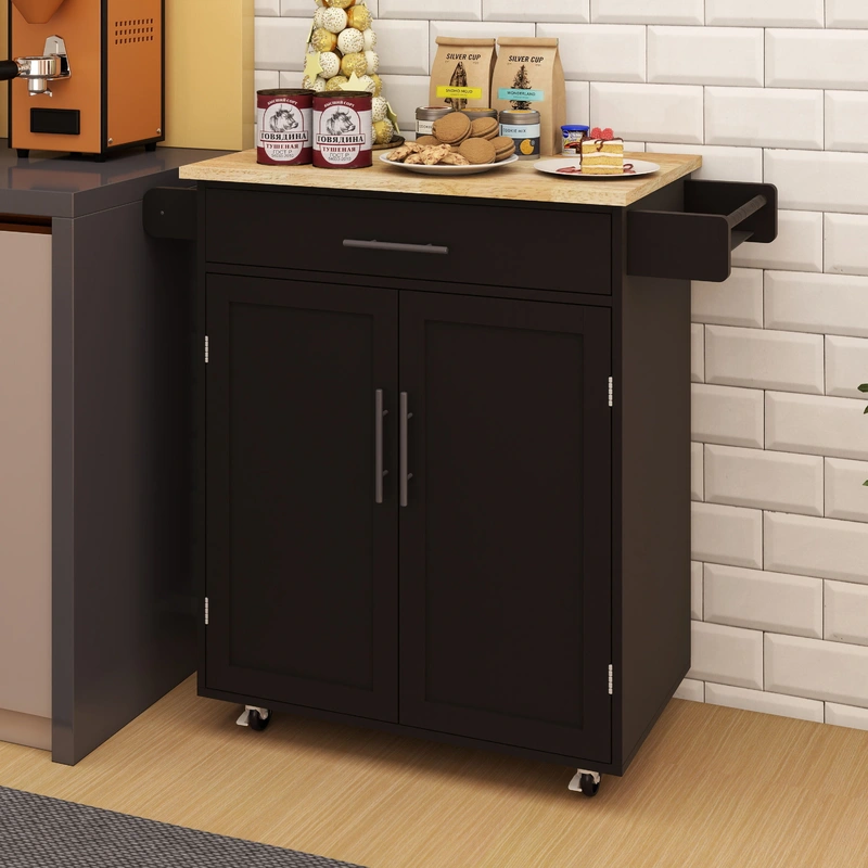 Rolling Black Wood Kitchen Island with Rubber Wood Top This sophisticated rolling kitchen island features a sleek black wood base and an elegant solid rubberwood top, perfect for enhancing your kitchen's functionality. Equipped with a spacious drawer, doub