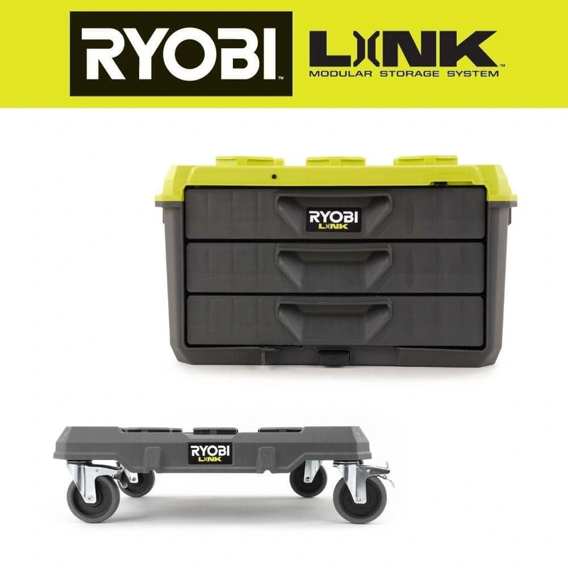 RYOBI LINK Rolling Base with 3-Drawer Tool Box Maximize your workspace mobility and storage efficiency with the RYOBI LINK Rolling Base and 3-Drawer Tool Box. This modular storage solution offers a robust 200 lbs capacity and impact-resistant construction,