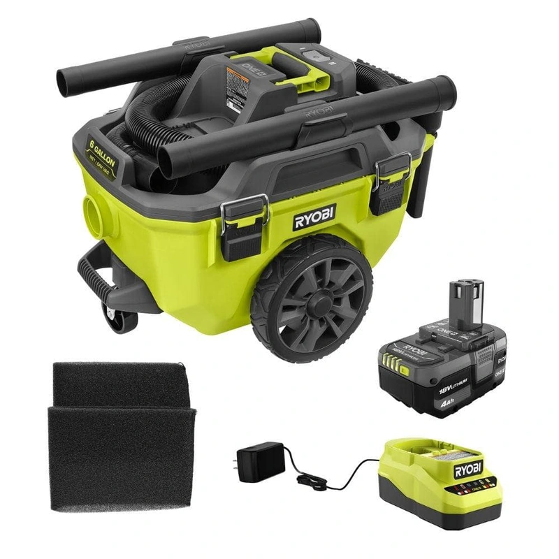 RYOBI 18V Cordless 6 Gal. Wet/Dry Vacuum Kit The RYOBI 18V Cordless 6 Gallon Wet/Dry Vacuum Kit delivers superior jobsite cleaning performance with enhanced suction power, allowing you to tackle any mess with ease. Built with an ergonomic all-terrain wheel
