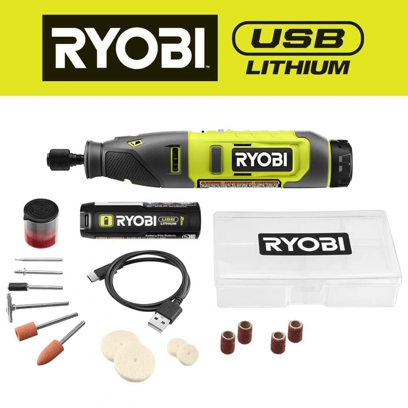 RYOBI USB Lithium Rotary Tool Kit Experience superior craftmanship with the RYOBI USB Lithium Rotary Tool Kit, designed for quick, efficient accessory changes and versatile applications. This compact, cordless tool comes with a 2.0 Ah USB Lithium battery t