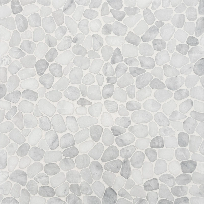 Elevate your space with the Satori Shoreside Bianco Marble Mosaic Tile, featuring a honed natural stone look that brings a touch of elegance to any decor. Ideal for indoor applications such as bathrooms, kitchens, and backsplashes, this tile offers a timeless pebble mosaic pattern and a matte finish. Engineered for both beauty and resilience, its perfect for medium to heavy traffic areas.