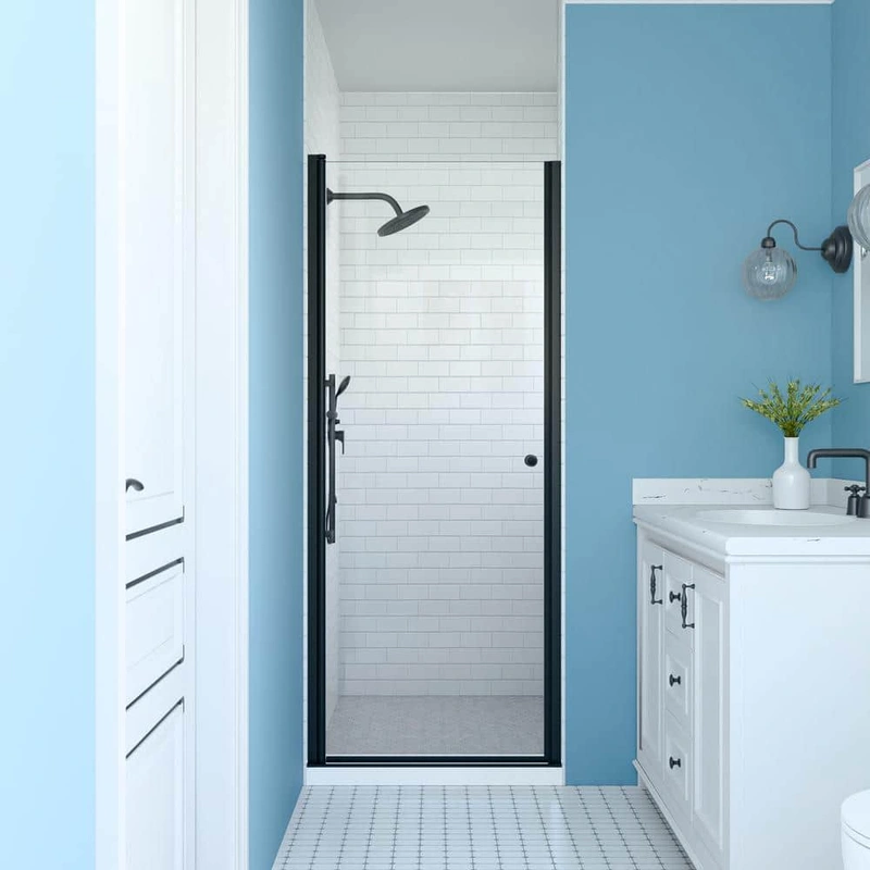 Transform your bathroom with the SHAAMA Pivot Semi-Frameless Shower Door, designed to blend modern aesthetics with functional superiority. This shower door features a clear tempered glass construction and a sleek matte black finish, offering an elegant and durable solution for any shower space.