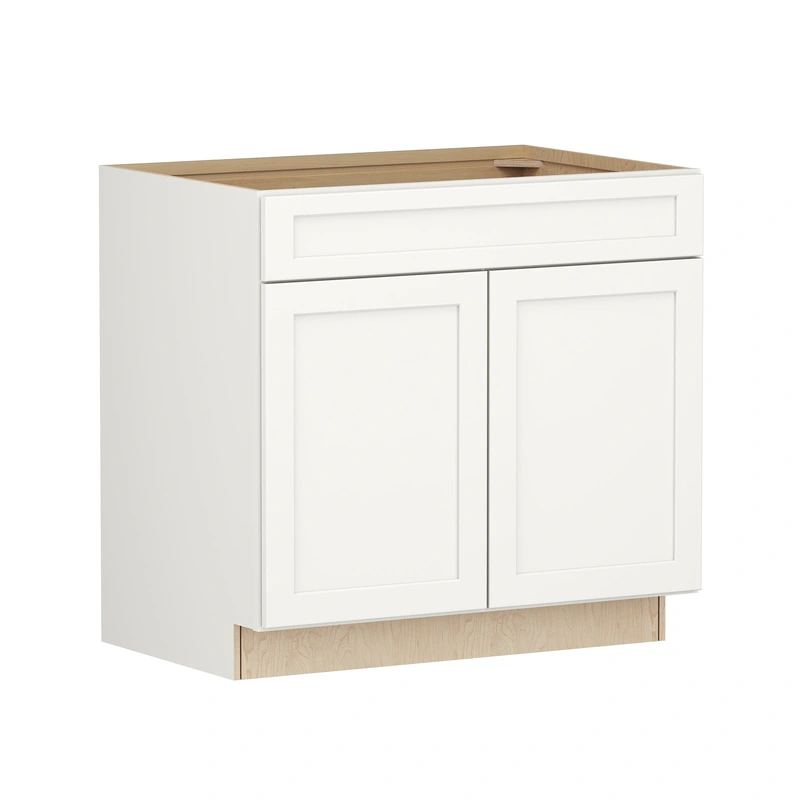 The Breckenridge Linen Shaker Sink Base Cabinet is a fully assembled, plywood construction solution for your modern kitchen or bathroom. Its elegant full-overlay recessed panel design provides a seamless, clean look that blends universality and contemporary charm, ensuring longevity and subtle sophistication.