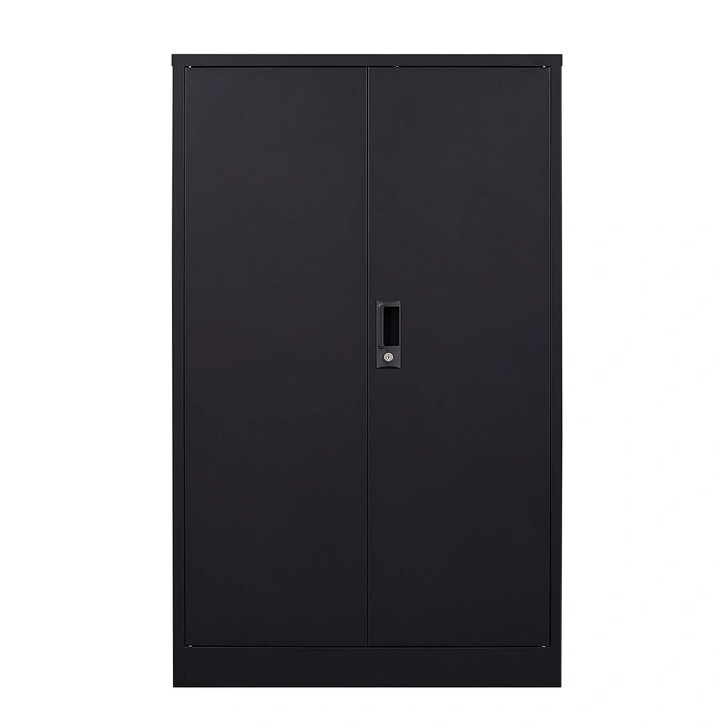 A: The cabinet is constructed from durable metal, offering a stylish black finish that suits various modern office designs while ensuring longevity.