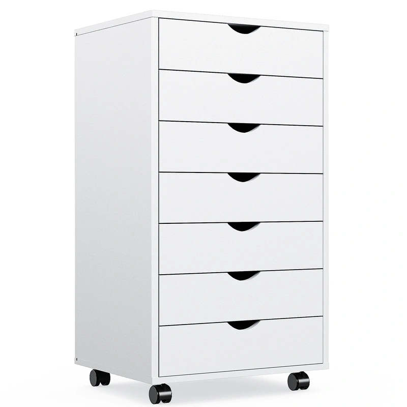 White 7-Drawer Office Cabinet The Siavonce White Office Cabinet is a versatile storage solution that combines modern design with practical functionality. Crafted with durable MDF board and metal slides, this elegant cabinet features seven spacious drawers