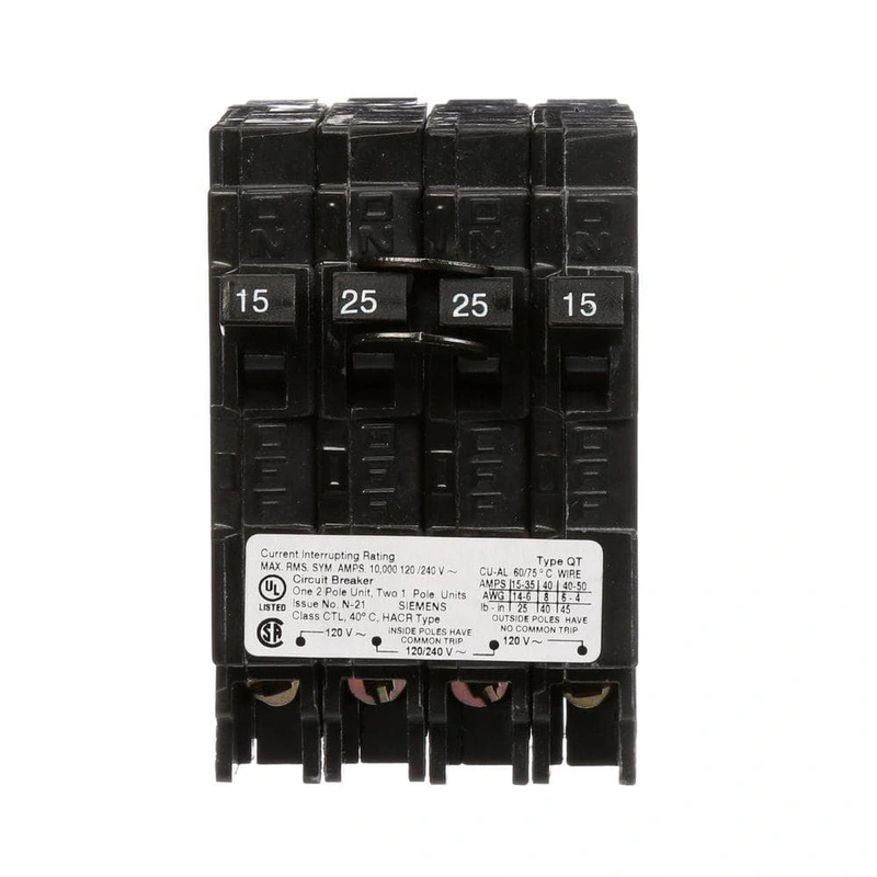 Siemens 25 Amp Double-Pole Triplex Circuit Breaker Safeguard your electrical system with the Siemens 25 Amp Double-Pole and (2) 15 Amp Single-Pole Type QT Triplex Circuit Breaker. It combines space efficiency with robust protection, fitting seamlessly into