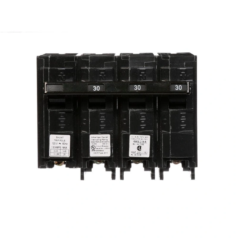 Siemens 30 Amp Three-Pole Circuit Breaker with Shunt Trip The Siemens 30 Amp Three-Pole Circuit Breaker with 120-Volt Shunt Trip offers superior protection with added functionality for remote tripping. Designed for residential and commercial applications,