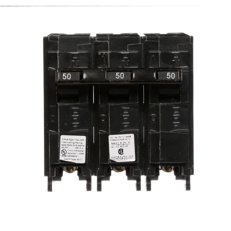 50 Amp Three-Pole Circuit Breaker The Siemens 50 Amp Three-Pole Type QPH Circuit Breaker offers uncompromising electrical protection for your Siemens panels, featuring a robust 22 kA interrupt rating. Perfect for residential and commercial applications, th