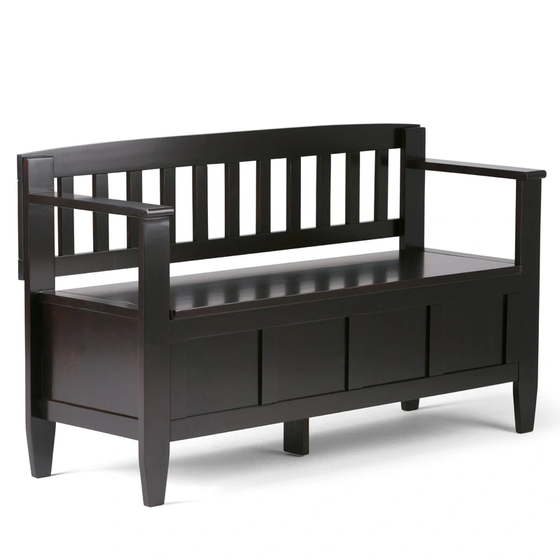 SIMPLI Home Brooklyn Storage Bench Discover elegance and utility with the SIMPLI Home Brooklyn Storage Bench. Handcrafted from premium solid wood and finished in a sleek coffee brown, this bench offers dual storage compartments and seating for two. Ideal f