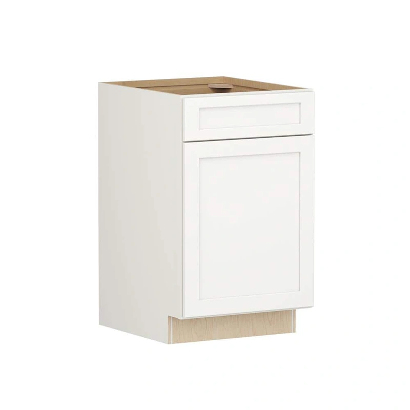Linen White Shaker Base Kitchen Cabinet The SIMPLY WOODMARK PRO Shaker Full Overlay Base Kitchen Cabinet in Linen White blends durability with timeless style. With its premium all-plywood construction, this cabinet is built to last, while the full overlay