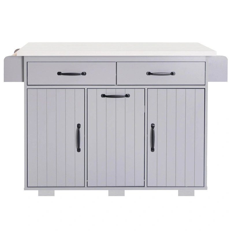 Maximize your kitchen space with the SINOFURN Gray MDF Rolling Kitchen Cart. This versatile piece features a durable MDF top and base, perfect for additional prep surface or storage. Engineered for mobility, it enhances functionality with its ample storage solutions, including drawers, cabinets, and a drop-leaf countertop.