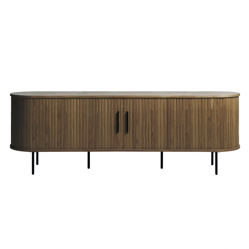 Smoked Oak Modern Wood Media Cabinet Elevate your living space with the Smoked Oak Modern Wood Media Cabinet, a fusion of contemporary style and practical functionality. Crafted with smoked oak, it features sleek tambour doors and matte black metal handles