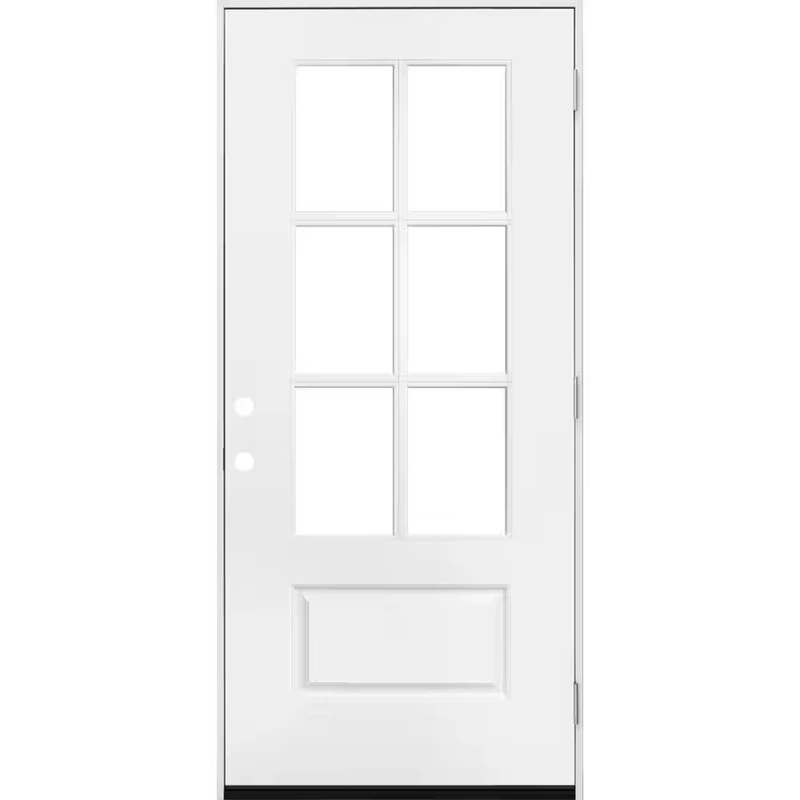 Product Description: Elevate your home’s entrance with the Steves & Sons Legacy 6 Lite 3/4 Lite Clear Glass Left Hand Outswing White Primed Fiberglass Prehung Front Door. This elegant 36″ x 80″ door combines durability, energy efficiency, and classic style to enhance your home’s curb appeal and functionality. The fiberglass construction ensures long-lasting performance in various climates, while the six clear glass panels allow ample natural light to brighten your entryway. Primed in white and featuring a left-hand outswing design, this door is ready for customization to match your home’s aesthetic.