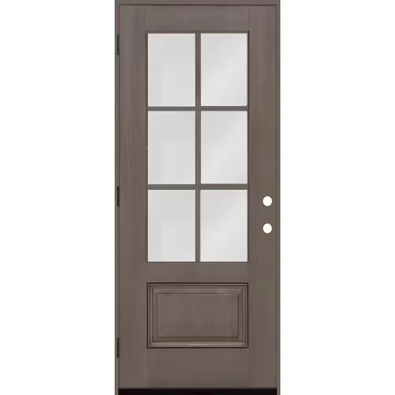 • A: The door features dual-pane, clear glass in a 3/4-6 lite configuration, offering both aesthetics and insulation.