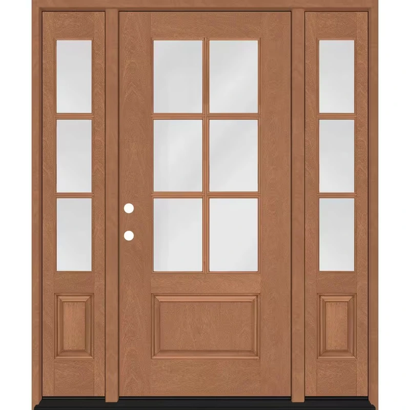 The Steves & Sons Regency 64 in. x 80 in. 3/4-6 Lite Clear Glass Right-Hand Inswing Front Door is a premium entryway solution that combines elegance, durability, and energy efficiency. This prehung fiberglass door features a stunning Autumn Wheat stain on a mahogany grain, creating a rich, warm appearance that enhances your home’s curb appeal. The 3/4-6 lite design with clear glass panels allows ample natural light to enter your foyer while maintaining privacy. Double 12-inch sidelites further amplify the light and create a grand entrance.