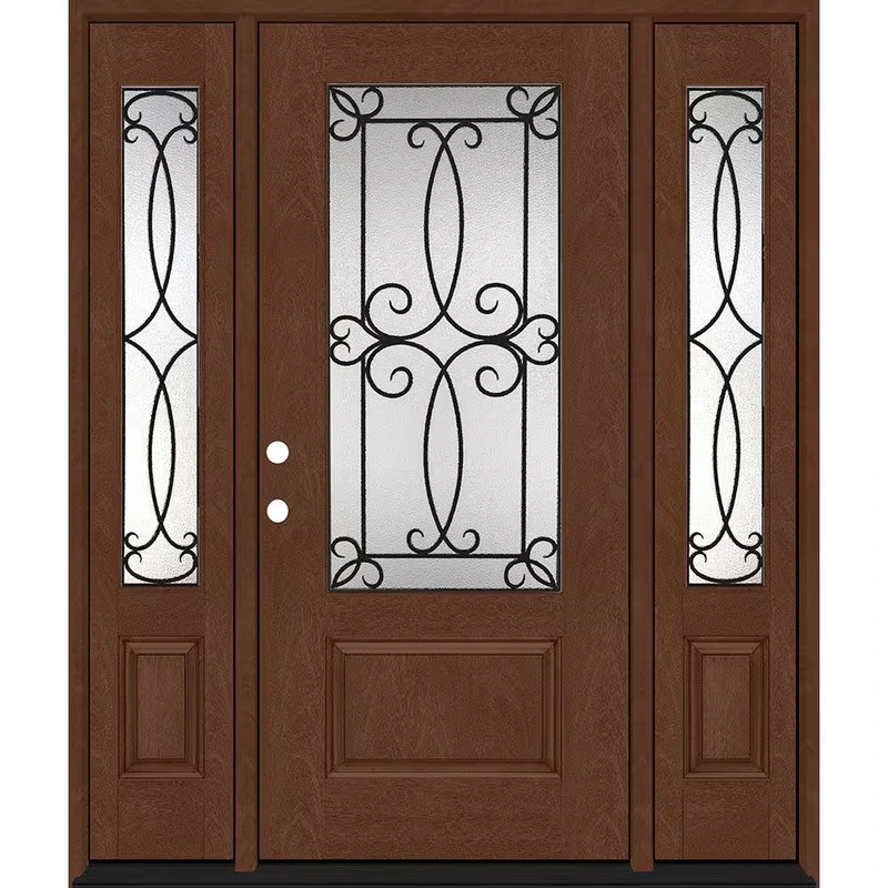 Elevate your home’s entrance with the Steves & Sons Regency Fiberglass Prehung Front Door. This elegant 64″ x 80″ door features a 3/4 Lite Georgian Decorative Glass design, offering a perfect blend of privacy and natural light. The chestnut mahogany finish exudes warmth and sophistication, while the fiberglass construction ensures durability and energy efficiency. Pre-hung for easy installation, this right-hand inswing door comes complete with 12-inch sidelites, enhancing your entryway’s overall appeal and functionality.