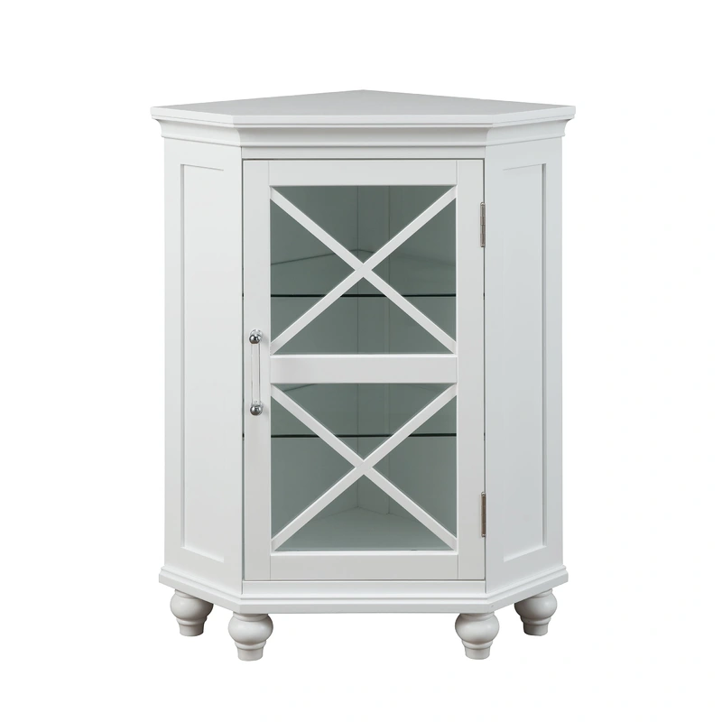 White Freestanding Corner Linen Cabinet Transform unused corner space with the Teamson Home Blue Freestanding Corner Linen Cabinet. This elegant, modern storage solution features a white exterior with a decorative acrylic pull, offering style and functiona